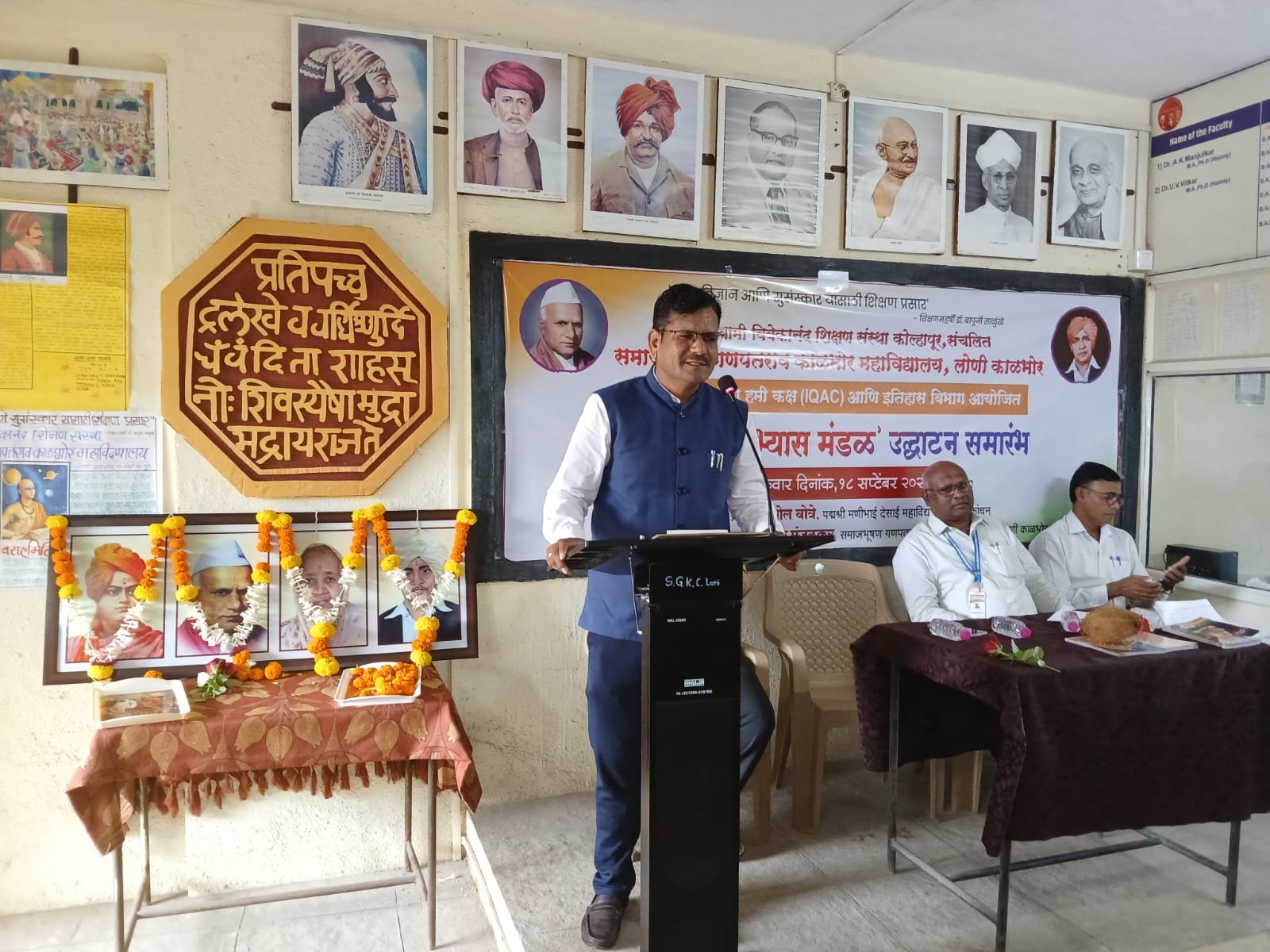या कार्यक्रमाचे अध्यक्षस्थान महाविद्यालयाचे प्राचार्य प्रा. डॉ. अंबादास मंजुळकर यांनी भूषविले. “मी स्वतः इतिहास विषयाचा प्राध्यापक असून आजवर २७ पुस्तके लिहिली आहेत. ती महाराष्ट्रातील अनेक विद्यापीठांमध्ये संदर्भग्रंथ म्हणून वापरली जातात. भारताच्या पाच हजार वर्षांच्या गतवैभवाचा व आधुनिक काळातील घटना-प्रसंगांचा अभ्यास करून ऐतिहासिक नोंदी घेणे विद्यार्थ्यांच्या बौद्धिक विकासासाठी आवश्यक आहे,” असे त्यांनी आपल्या भाषणात नमूद केले.