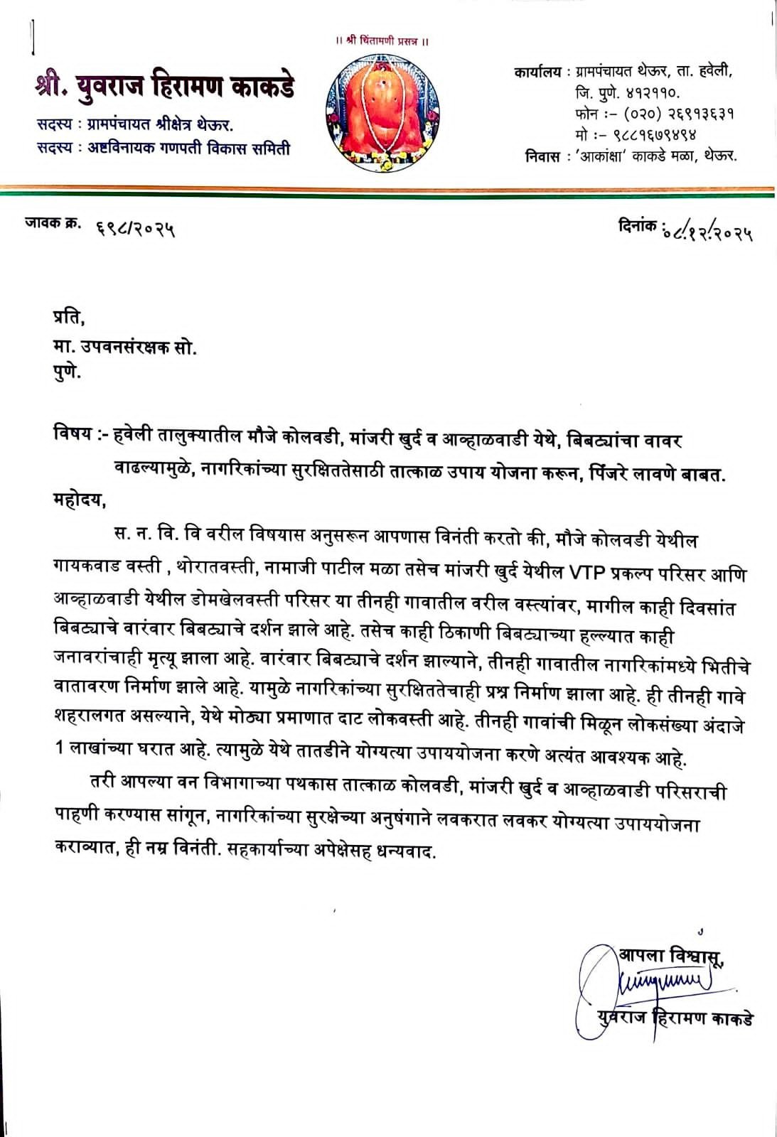 या संदर्भात ग्रामपंचायत थेऊरचे सदस्य तथा समिती अध्यक्ष श्री. युवराज हिरामण काकडे यांनी वन उपसंरक्षक, पुणे यांना सविस्तर निवेदन दिले असून बिबट्यांचा वाढता वावर असलेले ठिकाणे —